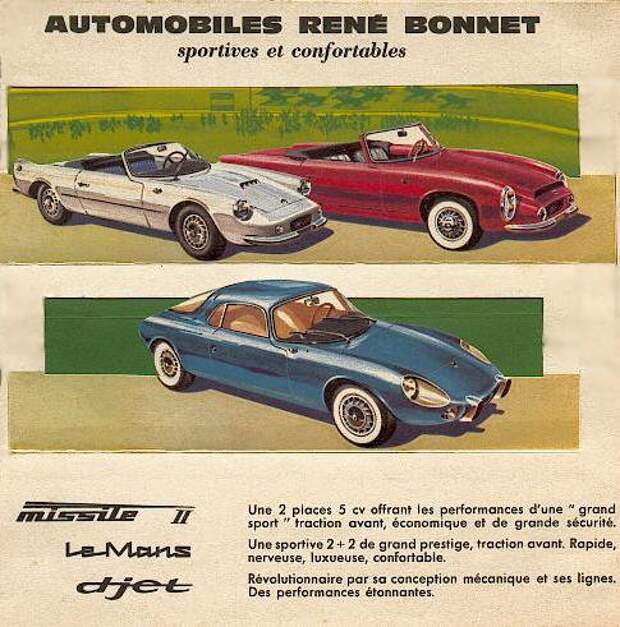 Что представлял из себя этот автомобиль?Очень интересный аппарат.Первый в мире серийный автомобиль со средним расположением двигателя.Конструктор автомобиля Рене Боннет-известный французский гонщик и конструктор.Имя и фамилия отражены в названии спорткара.Начинал производство своих спорткаров Рене в одиночку,но средств не хватило и пришлось продаться концерну Matra.