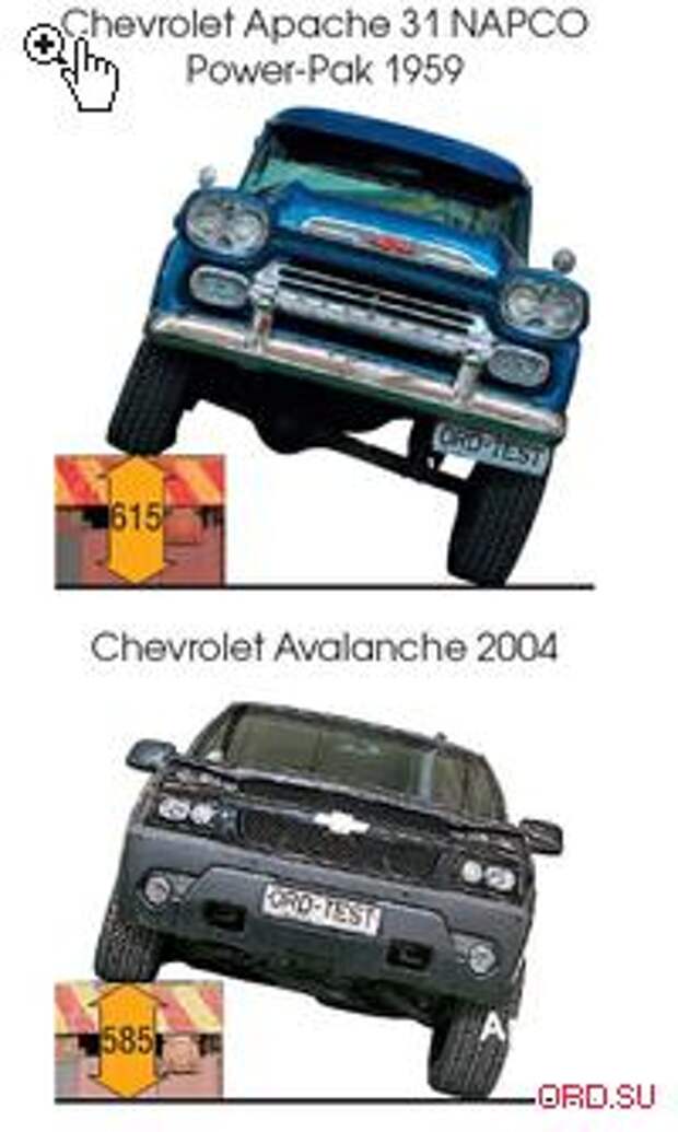 Ну раз такое дело - самое время начинать измерения. В общем, добро пожаловать на стенды, уважаемые «конкурсанты». Начнем, как водится, с артикуляции и опрокидывания. На самом деле чудес здесь никто не ждал (да их и не случилось). Длинноходная мягкая рессорная подвеска Apache отработала на скрещивание просто потрясающе. «Старичок» занес копесо на высоту, достойную лучших представителей вида. Результат в 615 миллиметров против 585 у Avalanche. И это при разнице в длине баз, превышающей 300 миллиметров не в пользу представителя XXI века. С другой стороны, направленность современного автомобиля на улучшение поведения на асфальте видна невооруженным глазом. Правда, для этого нужно... забраться под машину. Нет, ясное дело, что для обнаружения независимой передней подвески под Avalanche никуда лазить не надо, но вот такие удивительные вещи, как ход свободного сжатия до контакта рычагов с резиновыми отбойниками, равный семи (!) миллиметрам, -это явное указание на дорожное предназначение.