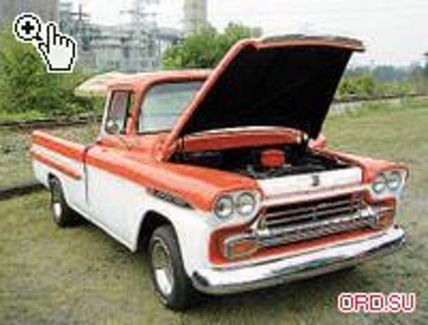 > Apache-типичный представитель расцвета американского «автомобильного барокко». Не зря же Брайан Зейцер, лидер рок-н-ролльной команды Stray Cats, назвал один из своих хитов «Все, что я люблю, осталось в 1959-м»... И действительно, этот год был особенно богат на хром и невероятные псевдоавиационные эле-менты дизайна. Одни обводы кузова чего стоят, не говоря уж о странных продольных наростах на капоте. Более того, в данном случае я бы отметил и некоторое сходство с нашим... ЗИЛ-130 (оно и понятно - дизайн этого автомобиля разрабатывался с оглядкой на американские грузовики того времени). Хромированные «надбровные дуги», прикрывающие две пары круглых фар, в сочетании с мощной радиаторной решеткой, не лишенной элегантности, плавно перетекают сквозь изгиб крыльев в декоративные стрелы с надписью Chevrolet Apache. В результате создается настолько четкий и бескомпромиссный образ, что дух захватывает. А как элегантно смотрится значок V8 на крыле (тут уже рождаются ассоциации с эмблемой УАЗ). Интересная форма форточек на дверях оттеняет два панорамных стекла. Вы только подумайте: заднее здесь - тоже панорамное! Ну и как завершение картины, гармонично очерчивая и дополняя общую округлую форму обводов, великолепно выглядящий стандартный для модификации 31 кузов типа Stepside (назван так по наличию боковой подножки для упрощения погрузки). Капот пикапа венчает красная надпись NAPCO Power-Pak. Вот она, сегодняшняя загадка. Правда, это скорее тема для отдельного материала, а посему... советую, откройте страницу 64.