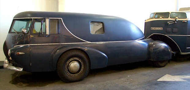 автопоезд был построен по заказу воротилы похоронного бизнеса Хьюберта Итона (Dr. Hubert Eaton - ему принадлежали кладбища Forest Lawn, посмотрите, там и прейскурант есть). Доктор Итон, похоже, был большой жизнелюб и использовал восьмиместных трейлер, названный им vagabond ("бродяга"), для охотничьих поездок и прочих экскурсий. в прицепе есть туалет, кухня, салон с круговым обзором (и интеркомом для связи с водителем).