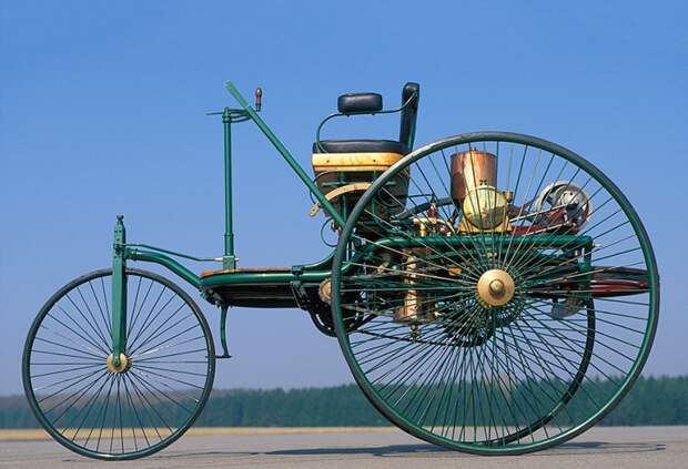 В первом трехколесном автомобиле Карла Бенца, построенном в 1885 г., использовался двигатель с водяным охлаждением. Он располагался горизонтально вместе с огромным горизонтальным маховиком и открытым коленвалом. Трехколесная конструкция автомобиля хорошо проявляла себя в езде по дорогам и мостовым, но имела проблемы с устойчивостью на пересеченной местности. Основная масса, включая двигатель и ездоков, распределялась на два задних колеса, в то время как переднее выполняло роль руля и практически не несло на себе нагрузки. Тем не менее Бенц вскоре отказался от трехколесной компоновки в пользу привычной четырехколесной.