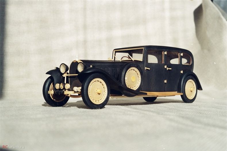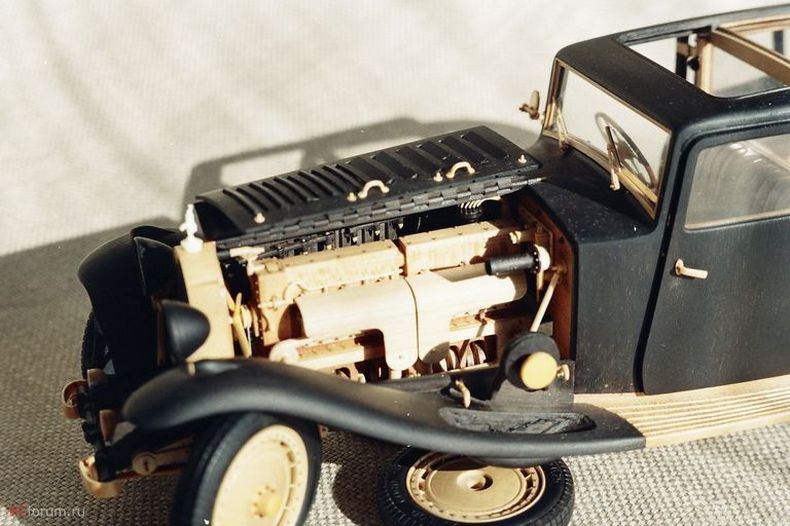 Интересно, что масштабные модели автомобилей , сделанные в 1990-х, уже по-падали и в прессу, и в Книгу рекордов Гиннесса (издание 1994 года) благодаря великолепной детализации (500-600 деталей) и точности, множеству подвижных элементов, уникальности работы. Но кто же догадывался тогда, что Сафонов не остановится на достигнутом — каждая новая модель оказывалась значительно сложнее предыдущей, и его последняя работа, Bugatti Туре 41 Royale Limousine Рагк-Ward, состоит из 2540(!) деталей. Модель автомобиля выполнена в масштабе 1:24, и в ней движется — без преувеличения — всё. Капот открывается и складывается, жалюзи на нем поворачиваются, открываются двери (причем работают даже дверные замки — чтобы открыть, нужно повернуть рукоятку на бамбуковой пружине), двигается рычаг ручного тормоза, подвеска прогибается под собственным весом модели. Если проворачивать задние колеса, срабатывает привод через карданный вал (косые шестерни), движется коленвал двигателя, вращается вентилятор. Рулевое управление также детализировано, выдержано даже передаточное отношение: на два поворота руля — полный поворот передних колес. Снимается крыша, выдвигаются ящички и бардачки в салоне, движутся дворники, откидываются дополнительные сиденья.
