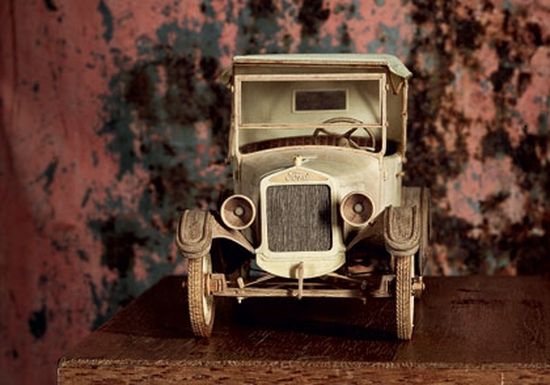 Эти масштабные модели автомобилей кажутся очень, очень хрупкими. Первая мысль, возникающая при взгляде на модели Сафонова, — как это сделано? Как можно выточить два десятка полумиллиметровых дверных петель, вставить в них еще более тон- кий штифт и заставить эту дверь открываться? Как можно выточить шестерни сцепления и соединить их с трансмиссией, если диаметр каждой шестерни не превышает нескольких миллиметров? При том, что все это не стальное, а деревянное, почти невесомое и требующее нечеловеческой точности в расчетах и обработке.
