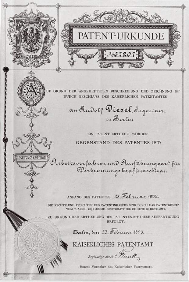 В 1893 году Рудольф Дизель получает свой первый патент, которым закрепляет за собой право собственности на теоретическое обоснование и конструкцию "рационального теплового двигателя" Естественно, Дизель, находясь на седьмом небе от счастья, с радостью принимает предложение, несмотря на молчаливое недовольство его родителей. Дело в том, что они не предполагали, что увлечение их сыном наукой так затянется и перейдет в теоретическую плоскость. Постоянно нуждающиеся в финансовой помощи, они уже как можно быстрее желали видеть Рудольфа, работающего на каком-нибудь предприятии и зарабатывающего наконец-то деньги. Однако Дизелю удавалось, как говорится, совмещать приятное с полезным. Поскольку уже очень скоро ему была присуждена хорошая стипендия, благодаря которой он не только смог обеспечивать себя сам, но и оказывать финансовую помощь родителям, чему они были чрезвычайно рады. Ну и, кроме того, благодаря своей поразительной трудоспособности и умению планировать рабочее время, Дизель успевал наслаждаться и другими своими любимыми занятиями – чтением и музыкой. Подобные черты личности очень сильно притягивали к Рудольфу людей на протяжении всей его жизни. Во время учебы в политехническом институте у Дизеля произошла одна из поворотных в его судьбе встреч. Одним из его преподавателей был известный инженер – профессор Карл Линде, занимавшийся разработками холодильного оборудования. В 1879 году Рудольф заболел брюшным тифом и не смог в положенный срок сдать со своим классом экзамен профессору. Вылечившись и ожидая следующей возможности аттестации, Дизель, не теряя зря времени, отправляется набираться опыта в инженерной практике в Швейцарию, где устраивается на работу на машиностроительный завод братьев Шульцер. Через год он вернулся и успешно сдал экзамен Линде, поразив того приобретенными знаниями и опытом. У профессора это был как раз последний год работы в институте, поскольку он решил заниматься прикладными исследованиями в организованной им компании "Хладогенераторы Линде". И, конечно же, он не мог просто так распрощаться со своим способным учеником, пригласив Дизеля к себе на работу, сразу же предоставив ему пост директора…