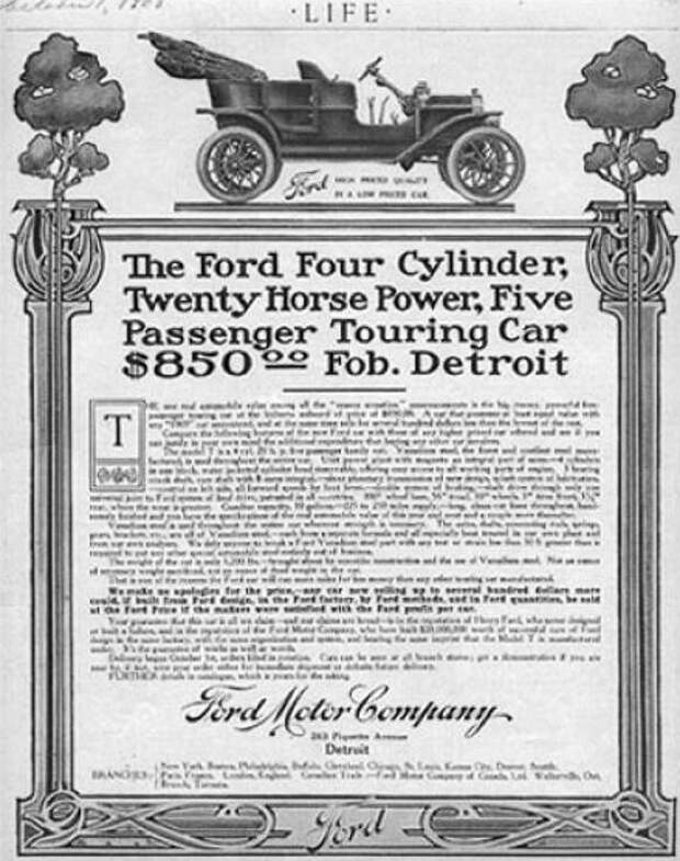Одна из первых рекламных полос, посвященная Ford T. Обратите внимание: в объявлении не указано даже название модели. Есть только мощность, количество мест и цена |