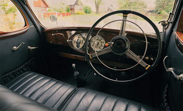 За рулем оказалось не так комфортно, как на месте пассажира. Огромное рулевое колесо упирается в живот, ноги обнаруживают, что педальный узел расположен совсем не так, как у современных автомобилей... Разумеется, никаких настроек кресла или рулевой колонки нет и в помине. Поворачиваю ключ, нажимаю кнопку, и электрический стартер запускает трехлитровый двигатель. Две первых передачи на четырехступенчатой коробке здесь не имеют синхронизаторов, так что надо использовать двойной выжим сцепления...