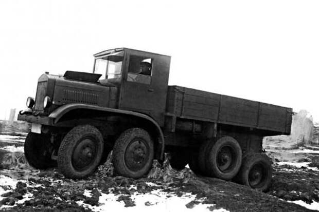 Апофеозом грузового автомобилестроения довоенных лет можно назвать 4-осный ЯГ-12 1932 г. Индекс указывает на схему привода – 12 колес, и все – ведущие. Это был один из первых в мире автомобилей такого типа. Машина весила 20 т., могла перевозить по асфальту аж 12 т. груза, и имела 9 карданных валов! Разумеется, в СССР не было мотора, способного сдвинуть такую махину с места, поэтому под капот установили американский 6-цилиндровый Continental-22R, объёмом 8,2 л.