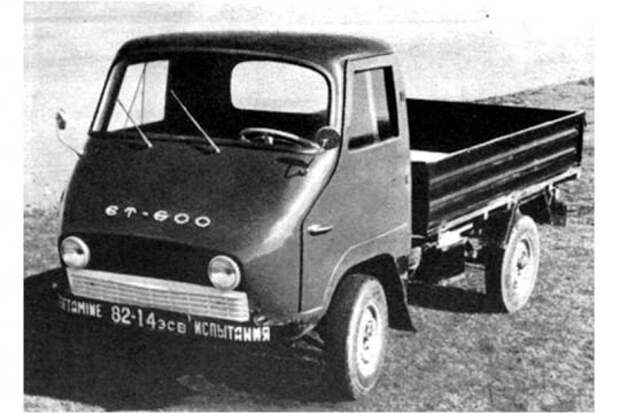 Пластмассовой была и кабина микрогрузовичка ЭТ-600, выпущенного одной из эстонских автобаз. Двигатель ЗАЗ-966 был расположен спереди под кабиной, передняя подвеска – независимая двухрычажная. При масса всего 750 кг машина могла перевозить 600 кг и разгоняться до 84 км/ч.
