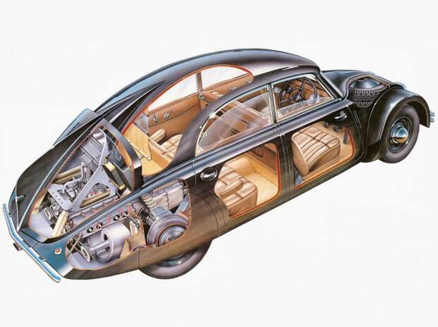 В начале тридцатых годов в компании создаются автомобили высшего класса T 70 и Т 80. В 1934 г. появляется на свет Т 77 – лимузин высшего класса с аэродинамическим кузовом и мощным в-образным 8-цилиндровым двигателем воздушного охлаждения, расположенным за задней осью. -