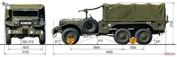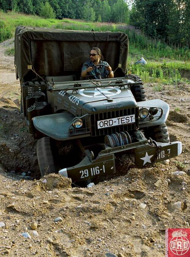 В качестве отрицательных моментов можно назвать большой передний свес (обусловлен силовой конструкцией бампера с креплением лебедки) и радиус разворота – 16,8 м (на асфальте). Остальные же геометрические параметры, включая и 270миллиметровый дорожный просвет, только подтверждают многочисленные легенды о невероятных способностях автомобилей Dodge серии WC преодолевать российское бездорожье.