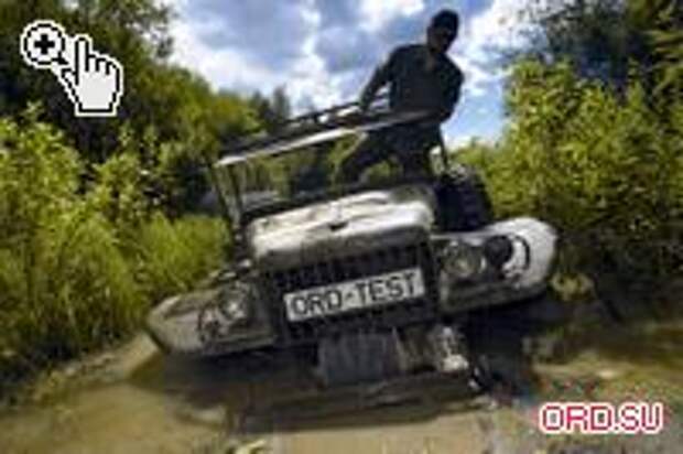 Накатавшись вволю по склонам «кратера», выезжаем на спецдорогу под названием «тяжелый грунт». Погода, правда, не очень радует наличием яркого солнца, основательно подсушившего грязевые «засады». Но мы не сдаемся и упорно ищем приключений на свой WC-63. Куда там, обнаруженные лужи и колеи давались машине настолько легко и непринужденно, что можно было начинать сомневаться в успешности самого теста на грунте. Ведь достойных препятствий (коих обычно в округе в изобилии) на этот раз найти, кажется, не получится. Впрочем, есть одно болотце... Хотя на самом деле это и не болото вовсе, а основательно заросшее русло реки с мягким илистым дном. По дороге попадаем в очень внушительную глинистую колею, но и она ни на секунду не останавливает наше продвижение к цели. Добравшись до места, начинаем штурм заболоченной речки. Но так как лебедка у нас расположена спереди, забираться в речку приходится задним ходом. И вот я, маневрируя между березок, опускаю заднюю часть машины в воду. Едет! Пробуем немного дальше... Снова едет. А всему «виной» очень маленькая скорость на нижнем ряду РК, не позволяющая разгрызть протектором грунт. Еще немного? Нет, «копучая» резина все-таки провернулась и моментально выкопала под колесами шесть глубоких ям. Но при этом машина все еще могла двигаться, естественно, закапываясь при каждом последующем проезде туда-сюда все сильнее и сильнее. Заглохли...