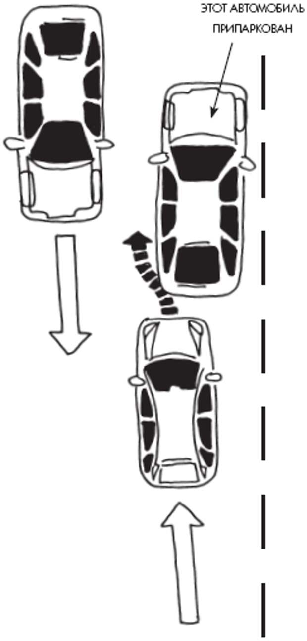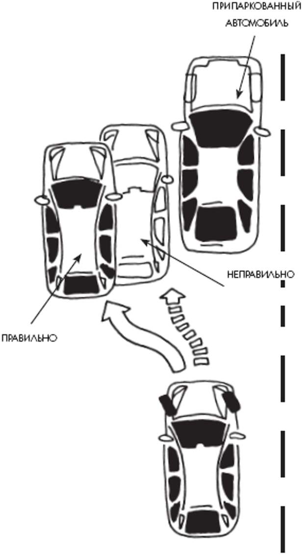 Этот же прием поможет и в ситуации, когда трудно выехать со стоянки, – спереди и сзади очень близко стоят другие автомобили и места очень мало. Только переставлять машину надо будет уже влево. Значит, первый поворот руля – влево до упора, половина пути вперед, поворот вправо до упора, вперед. Руль прямо и назад.