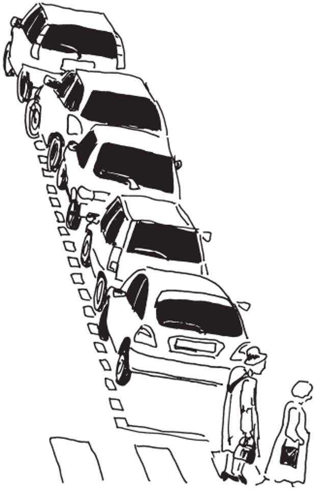 «Не езди в Париж на машине. Там невозможно ездить!» – говорили мне знакомые. Ездить, оказалось, можно, но запарковаться – без шансов! Поиск места у дома вечером после работы в течение часа – обычное дело. Для парижан отсутствие свободных мест на парковке – настоящий бич. Нередко парковку удается отыскать только в другом квартале, и на том спасибо! Вот где экономят каждый квадратный миллиметр: машины стоят ровно, как по линейке, буквально бампер в бампер, никому не придет в голову занять одной машиной два места (рис. 31). Мои знакомые парижанки, бывшие москвички, рассказывали, что могут запарковаться или выехать с парковки, если спереди и сзади есть хотя бы по три свободных сантиметра. Сначала я не поверил, но нужда заставила самого попробовать – научился. Главное, поворачивать колеса в определенной последовательности от упора до упора, как мы с вами проходили.
