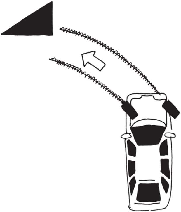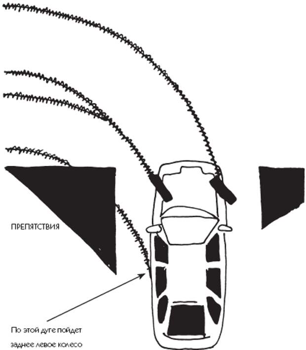 Главные проблемы маневрирования возникают при движении задним ходом, а также в ограниченном пространстве, сложность состоит в уводе кузова автомобиля в сторону при вывернутых колесах. Для того чтобы не помять боковины автомобиля касанием о препятствия, необходимо почувствовать это боковое движение, увод корпуса автомобиля в сторону при повороте (рис. 22). Перед поворотом налево, для того чтобы не задеть препятствие левыми дверьми, надо обязательно сначала сделать так называемый заход направо (рис. 23).