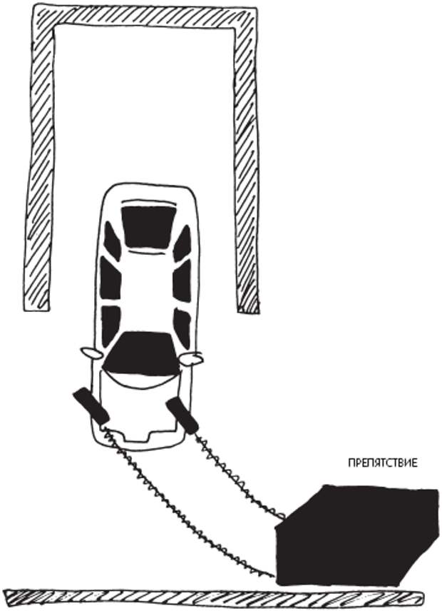 В ситуации, которая показана на рисунке (рис. 24), водитель столкнулся с проблемой при выезде из гаража. Он делал все правильно, но автомобиль не вписался в свободное пространство из-за препятствия, оказавшегося на его пути. Вот бы переставить машину буквально на метр левее, и тогда бы все получилось. Сделать это очень просто: при движении вперед надо вывернуть колеса сначала до упора влево, а потом до упора вправо, выровнять их и снова подать назад. Автомобиль окажется как раз на метр левее, что позволит закончить маневр.