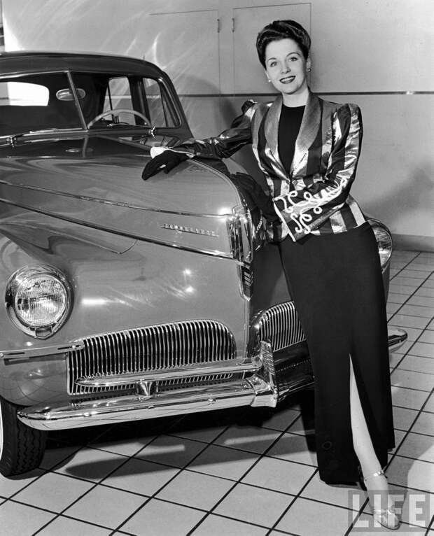 Гладкость, элегантность олицетворяются в черном вечернем платье с золото-черным полосатым пиджаком. Он создан, чтобы соответствовать новому седану Studebaker Landcruiser.