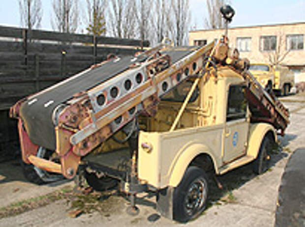Уникальный транспортер АТ-4 на шасси ГАЗ-69 кроме как на этой площадке, наверное, нигде не сохранился. Предназначался для механизированной загрузки грузов, почты и багажа в транспортные отсеки воздушных судов. На снимке АТ-4 в транспортном положении |