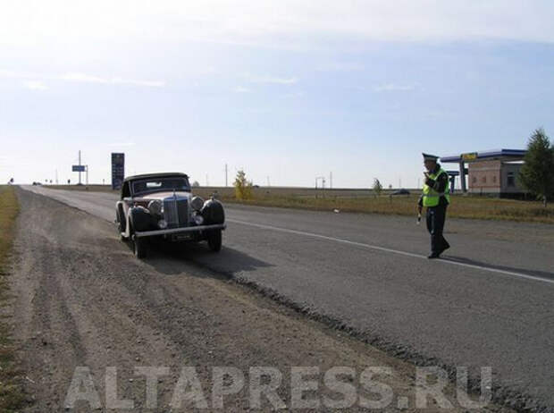 Инспектор ГИБДД никак не может упустить шанс тормознуть участников, чтобы полюбоваться на винтажный олдтаймер